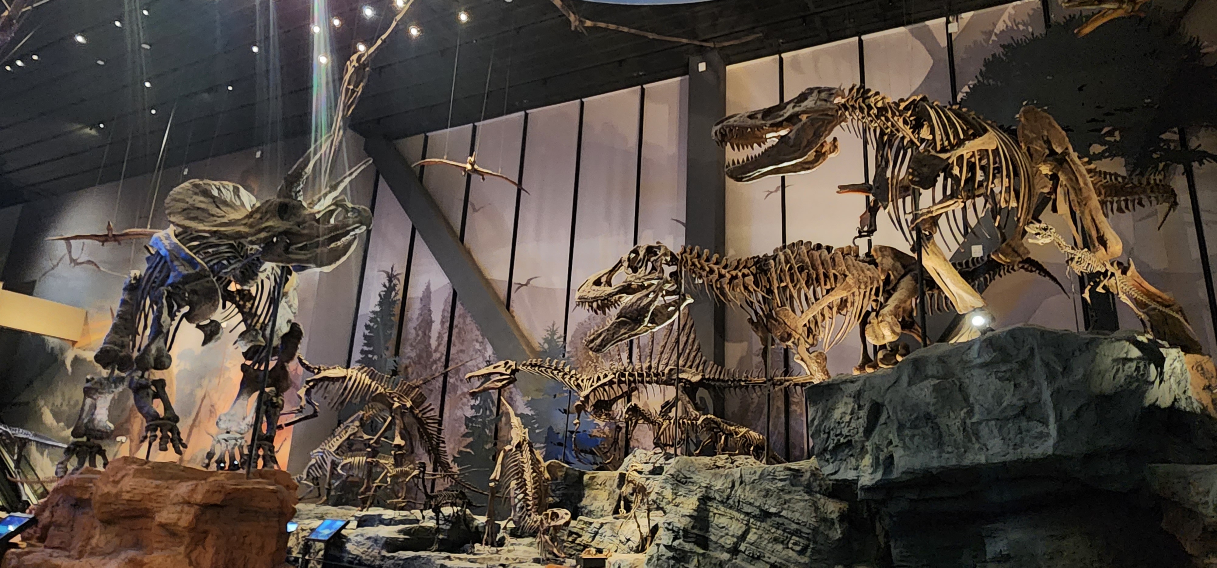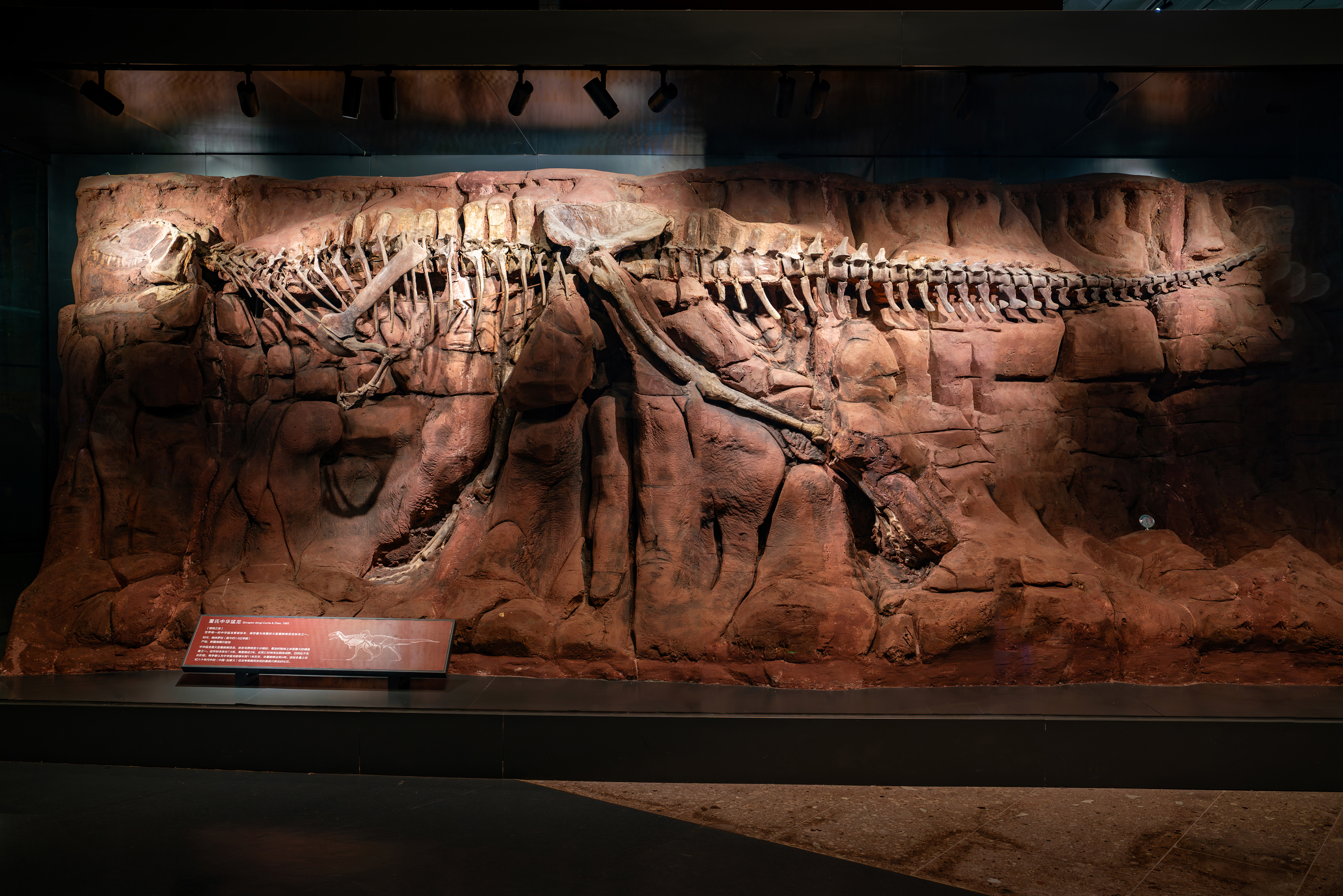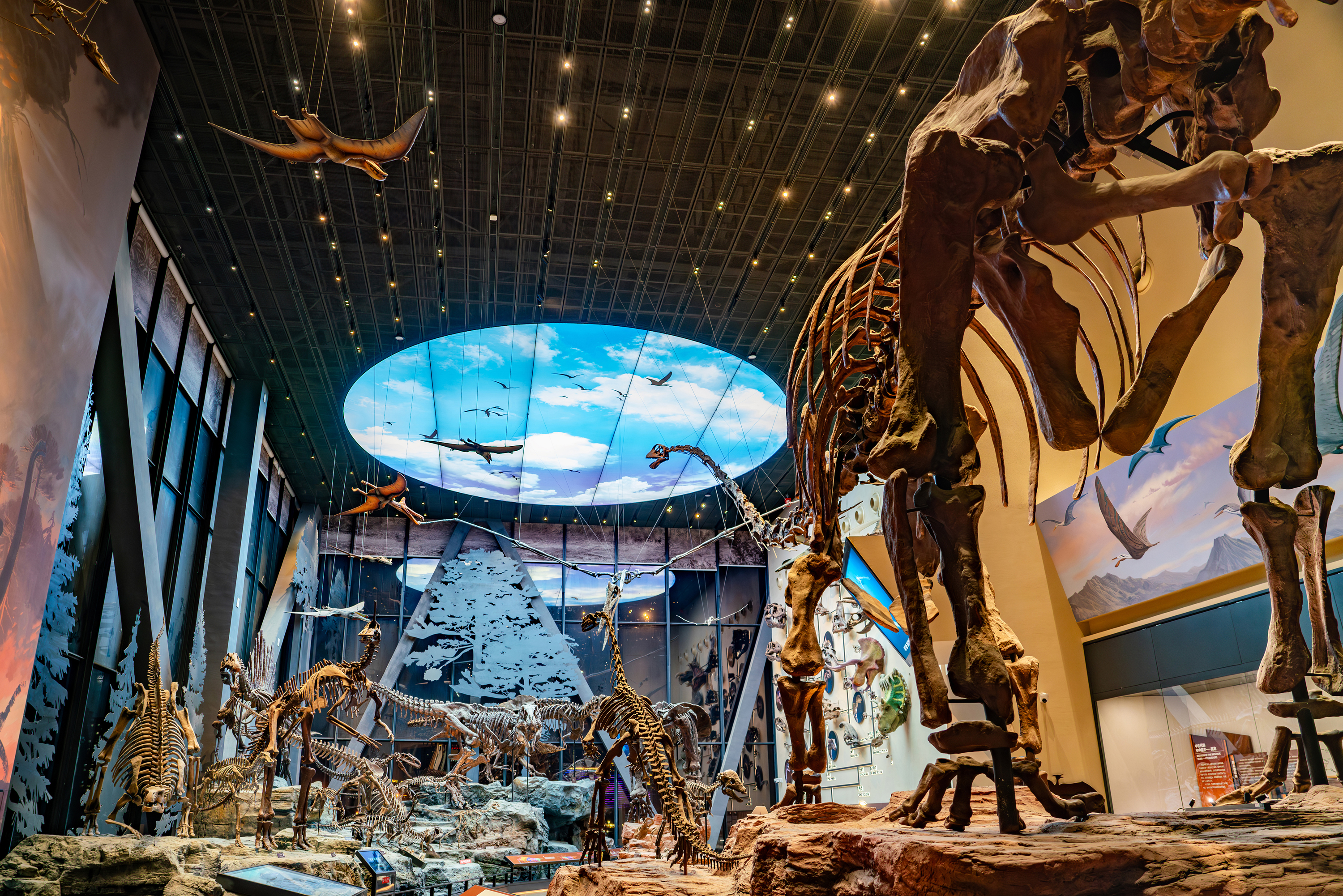 观众只要踏入“恐龙帝国”展厅,各种恐龙骨架和复原模型让人目不暇接,仿佛瞬间穿越回了中生代,那个爬行动物称霸地球的辉煌时代。巨大的中加马门溪龙(Mamenchisaurus sinocanadorum)骨架雄踞大厅中央,它的脖子长达15米,是世界上脖子最长的恐龙,仿佛一条巨龙蜿蜒盘旋,气势恢宏;展厅上空,沧龙、蛇颈龙和翼龙的骨架模型展翅翱翔,它们与地面上的恐龙相互呼应,构成了一幅壮观的远古生态画卷。在这些恐龙化石中,最珍贵的当属世界唯一的中华猛龙(Sinraptor dongi)骨架标本,它体长约7.6米,高度近3米,保存得相当完整,是研究恐龙演化的重要实物资料。站在中华猛龙骨架前,仿佛能看到了它在远古的草原上奔跑捕猎的矫健身影,观众心中必定对这些史前巨兽充满了敬畏之情。