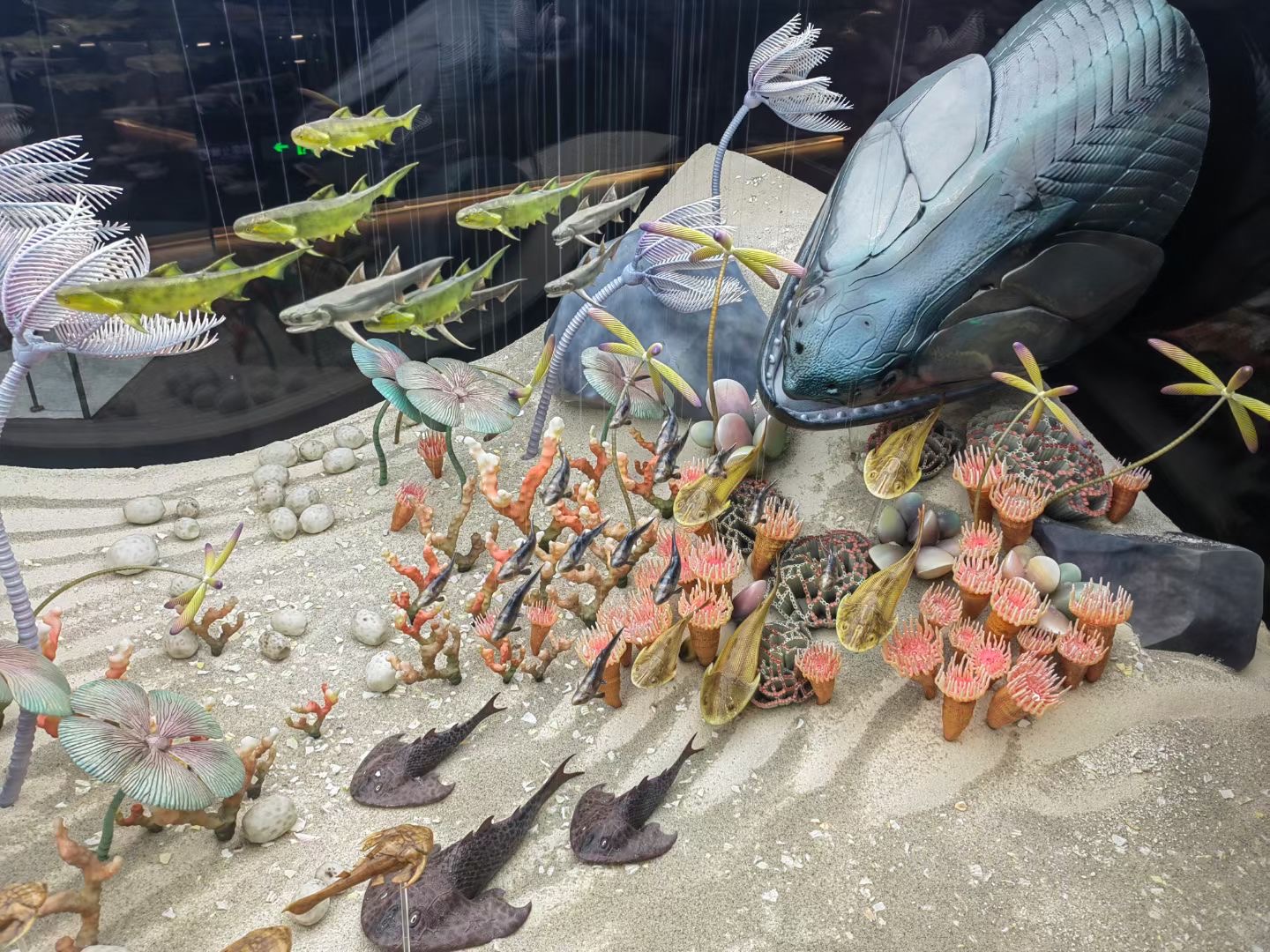 “远古海洋”展厅仿佛是一个被时光封印的蓝色世界,弥漫着神秘而古老的气息。一条长达8米的邓氏鱼模型威风凛凛地雄峙着,它巨大的身躯和锋利的牙齿让人不寒而栗,仿佛能感受到它在远古海洋中称霸的威严。四周的墙壁上,绘制着逼真的海洋壁画,五彩斑斓的珊瑚、摇曳的海草以及各种奇特的海洋生物栩栩如生,配合着展厅内模拟的水下微光和轻柔的海浪声,让人仿佛置身于远古的海底世界。展柜里陈列着各种海洋生物的化石,从三叶虫、海百合到菊石、鹦鹉螺,它们见证了远古海洋生物的繁荣与演化。其中,最引人注目的当属奇迹秀山鱼(Xiushanosteus mirabilis)化石,这是已知时代最早的头尾完整保存的有颌鱼类,它的发现将完整有颌类的化石记录向前推了1100万年,为探究颌的起源与有颌类早期演化提供了极为重要的证据。站在展柜前,看着这块小小的化石,不禁让人感叹生命演化的奇妙与伟大。