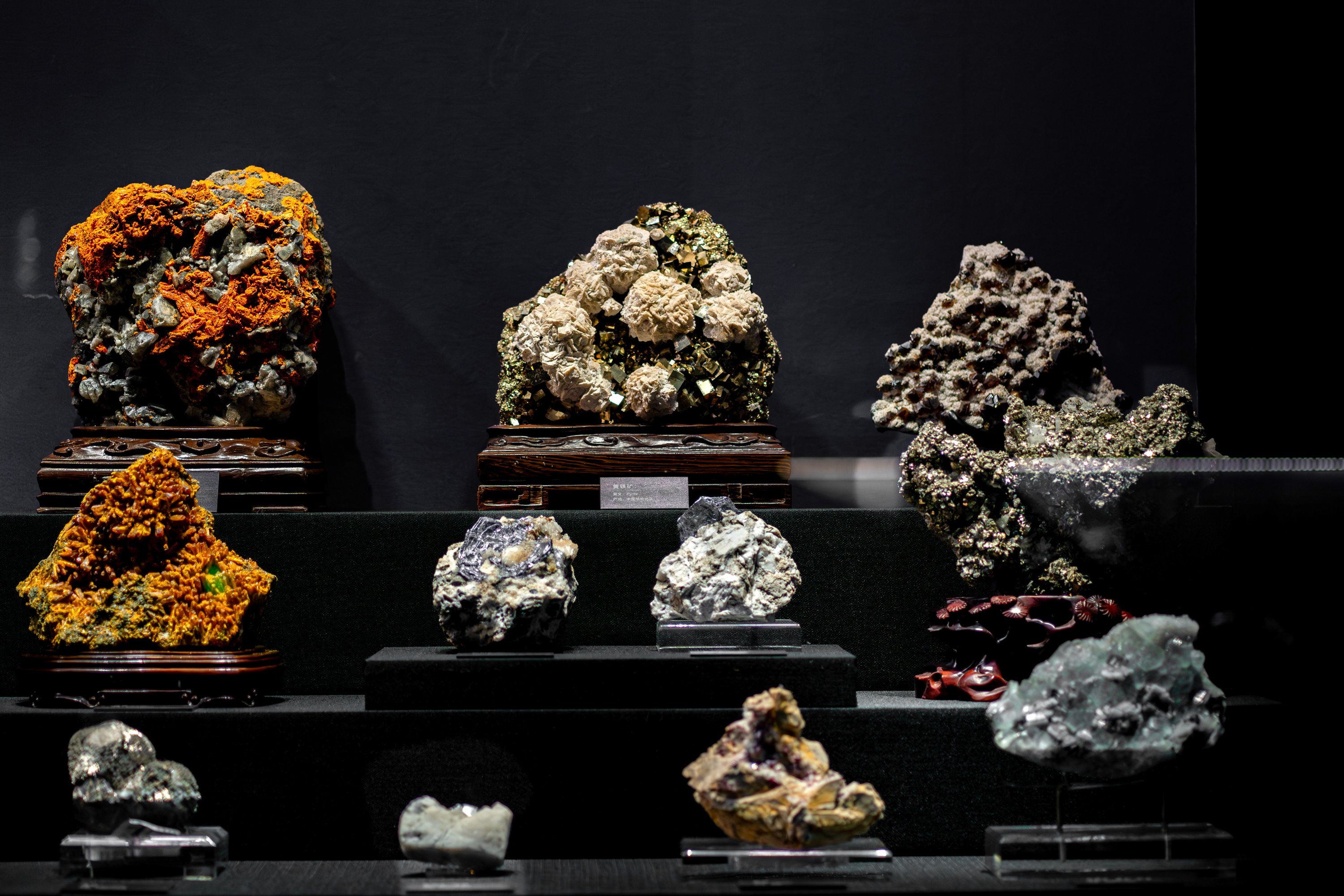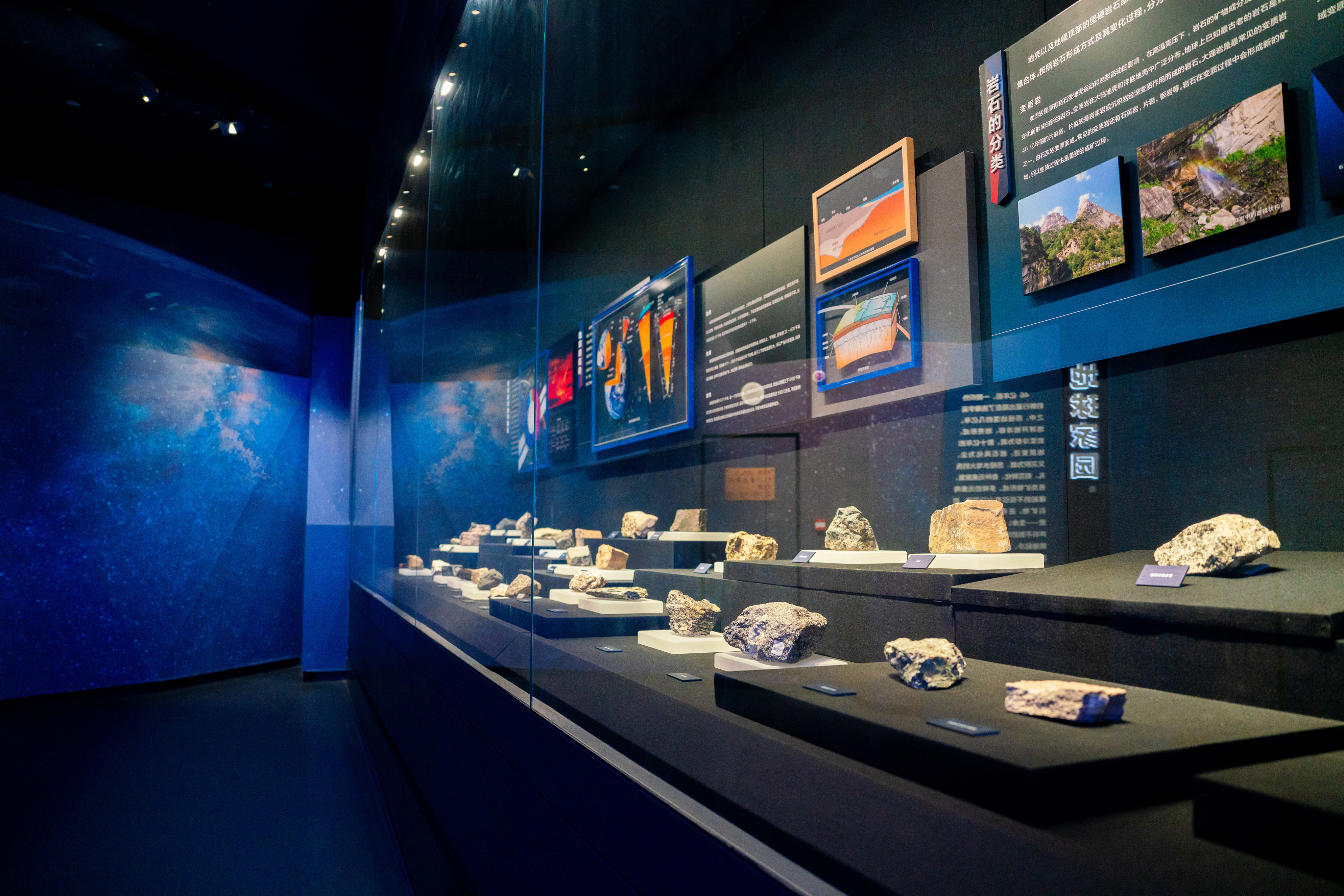 移步前行,各种矿物晶体标本依次映入眼帘。它们形态各异,色彩斑斓,有的如璀璨星辰,有的似流动的火焰。在灯光的映照下,萤石散发着梦幻般的荧光,石英则闪耀着纯净的光芒,这些石头仿佛是地球历史的无声见证者,默默诉说着亿万年的沧桑变迁。一旁的展板上详细介绍了岩石的形成过程和地质年代的划分,从古老的太古代到新生代,每一个时期都有着独特的地质特征和生命演化轨迹。