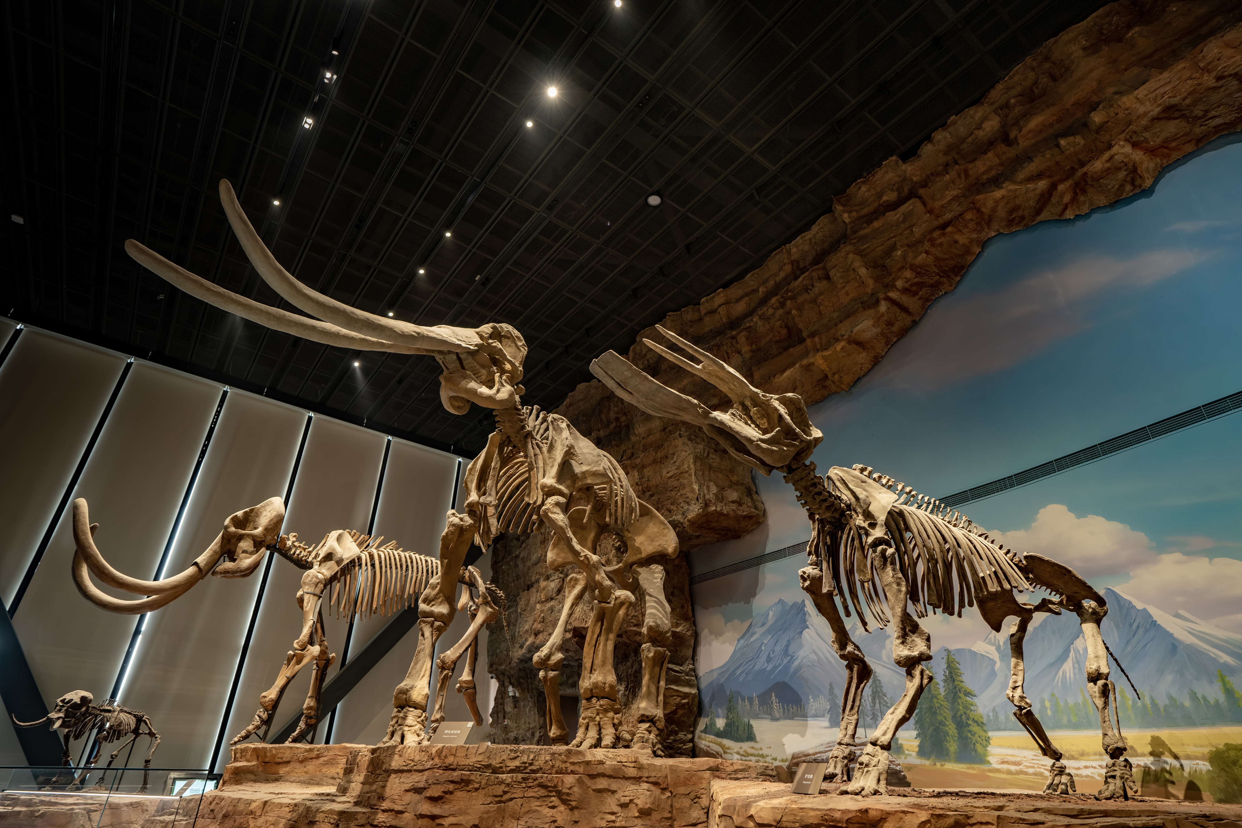 展厅入口处,一条形似产道的长廊寓意着生命的诞生与延续。穿过长廊,首先映入眼帘的是猛犸象、剑齿象和铲齿象三具巨大的骨架,它们高大的身躯和独特的外形让人惊叹不已。猛犸象浑身长满了长长的毛发,象牙又长又弯,仿佛在诉说着它曾经在冰天雪地的北方草原上生活的故事;剑齿象的一对巨大獠牙向下弯曲,犹如两把锋利的长剑,让人望而生畏;铲齿象的下门齿特化成了铲子状,这是它适应特殊环境的独特进化特征。