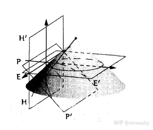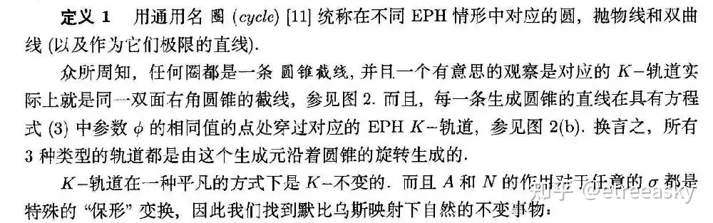 为什么,射影几何中能够把椭圆、抛物线、双曲线看作是同一种类图形,究其根本是因为三者的射影变换群轨道都是圆锥体的表面,而群轨道表征了一个群结构的基本结构。