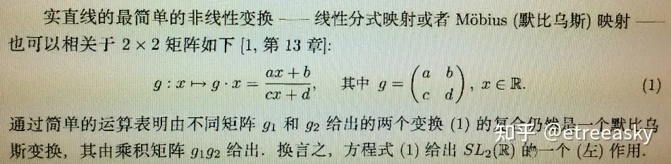 一、erlangen纲领1.1、默比乌斯映射的SL2(R)群矩阵下面我们来粗略探讨erlangen纲领的对于深度学习人工智能的指导思想。 [以下主要内容摘自《Erlangen纲领初阶:从群SL2(R)开始》]