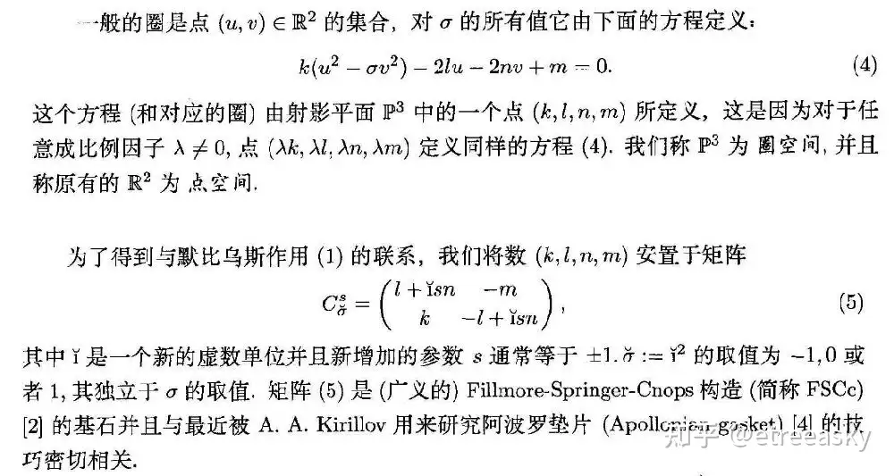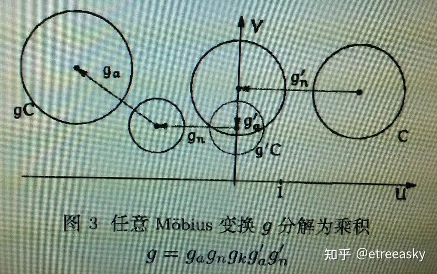 现在,我们考虑某个研究对象(比如圆形)对于默比乌斯映射(膨胀变换、左平移作用、旋转变换的复合变换)的特征属性“不变性”: