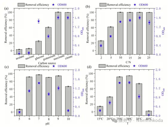 3.环境因子优化:通过单因素实验确定了菌株DC-2的最适脱氮条件