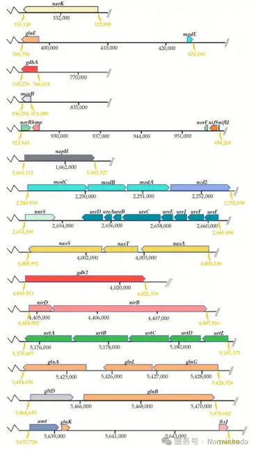 注释了与好氧反硝化相关的基因(如napH(硝酸盐还原)、norR( nitric oxide reduction)),但缺乏典型的nirS/nirK(亚硝酸盐还原)和nosZ(氧化亚氮还原)基因,推测其可能通过非典型途径(如nirBD)进行反硝化。