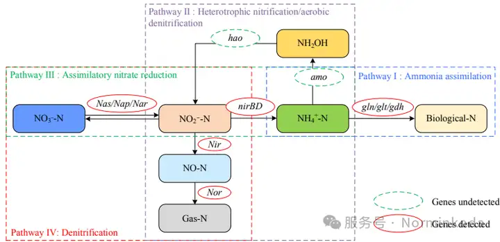 :基于以上结果,研究提出了DC-2菌株的综合氮代谢网络模型,主要包括:I) 氨同化;II) 异养硝化-好氧反硝化(HN-AD);III) 同化性硝酸盐还原(ANRA);IV) 反硝化作用。