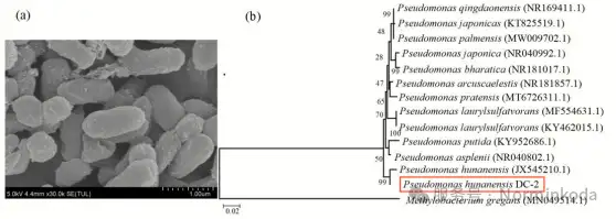 菌株分离与鉴定:从滇池沉积物中分离出一株高效好氧反硝化菌DC-2。通过扫描电镜观察其呈短杆状(长度<1μm),经16S rRNA基因序列分析(GenBank登录号: PP528522),鉴定为Pseudomonas hunanensis。
