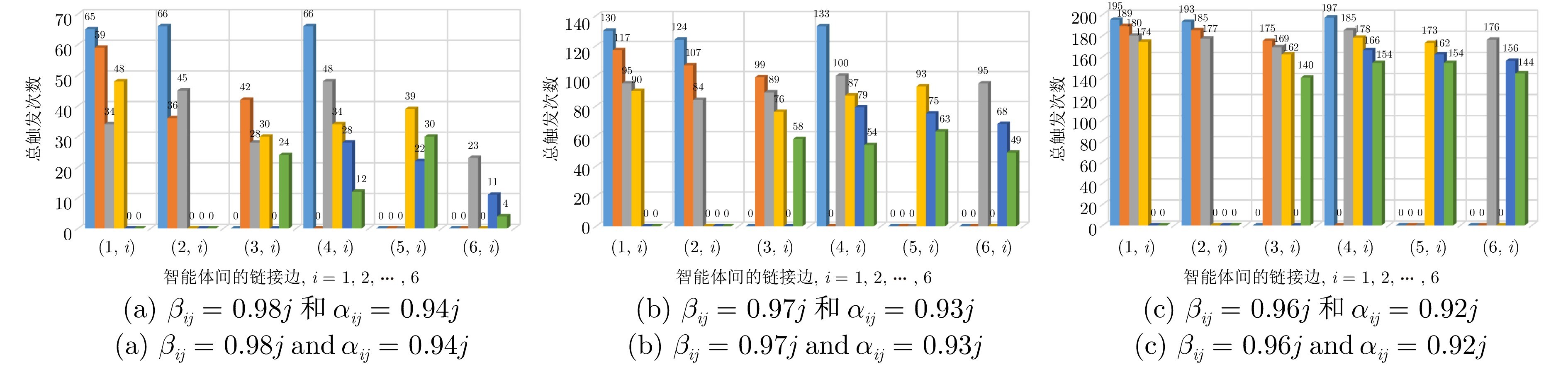 图 3 算法1下不同参数对应的链接边触发次数($ j = 1,\;2,\; \cdots, \; 6 $)