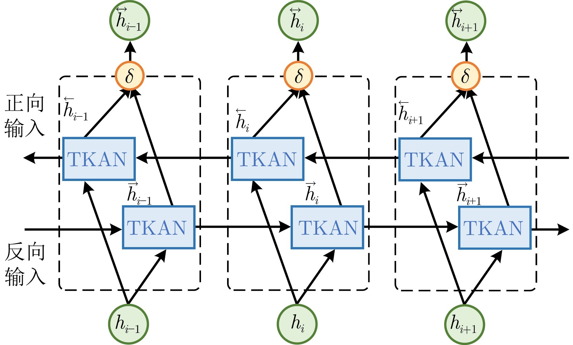 1) 基于TKAN提出一种新的双向时间建模框架, 可有效捕获时间序列的前向和后向依赖关系, 同时引入全局注意力机制, 对输入数据中关键时间步的特征信息进行自适应聚焦, 动态分配权重, 有效抑制了冗余信息对预测结果的干扰, 进一步提高了预测的精度和稳定性.