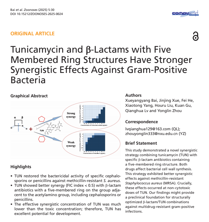 Bai XYY, Xue JJ, He F, Yang XT, Liu HR, GK, Lv QH, Zhou YL. Tunicamycin and β-lactams with five membered ring structures have stronger synergistic effects against Gram-positive bacteria. Zoonoses. 2025; 5(1): 30. DOI: 10.15212/ZOONOSES-2025-0024