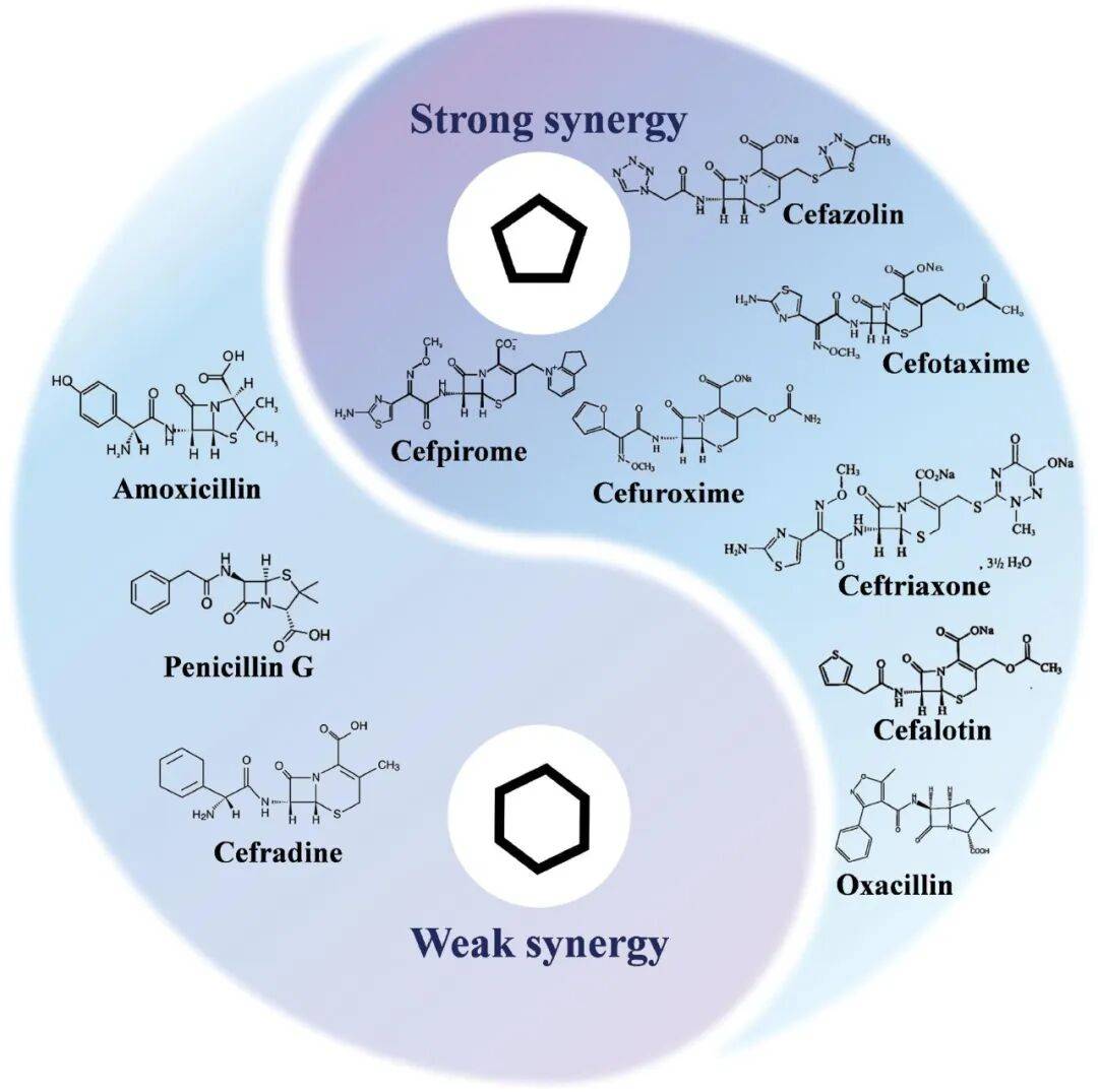 研究结果显示,无论是青霉素类还是头孢菌素类,在其结构中的β-内酰胺环7号位侧链连接一个五元环结构后,与衣霉素具有显著的协同作用,反之协同效果并不理想。