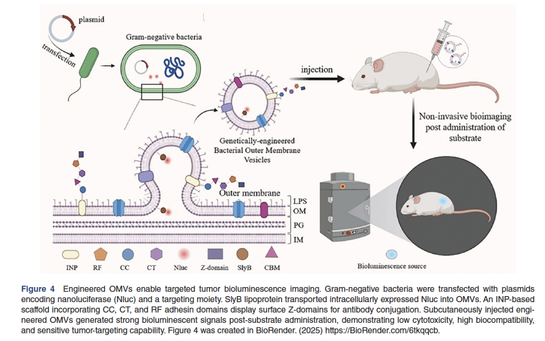 图4:工程化OMVs实现靶向肿瘤生物发光成像,该图揭示了工程化OMVs的构建过程及其在活体内实现高信噪比生物发光成像的机理,展现了其在肿瘤精准诊断中的应用潜力