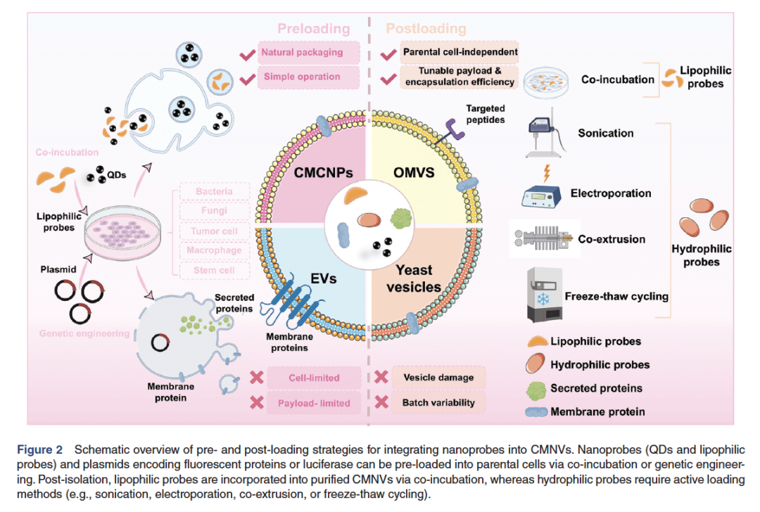 后加载:对已提取纯化的CMNVs,采用电穿孔、超声、共挤出等物理化学方法,将探针主动嵌入到囊泡内部或膜上。