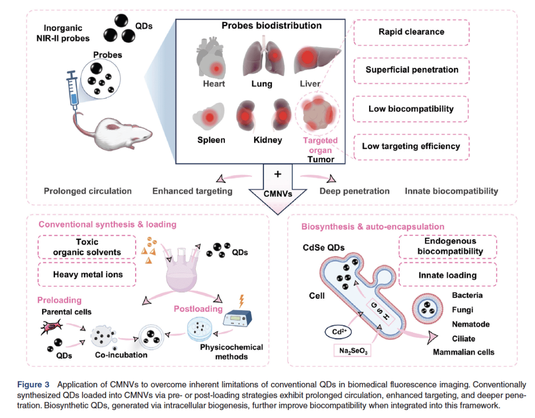 图3:CMNVs提升量子点荧光成像性能,该图展示了CMNVs如何克服传统量子点的局限性,实现更长的血液循环、更深的组织穿透和更高的靶向效率。