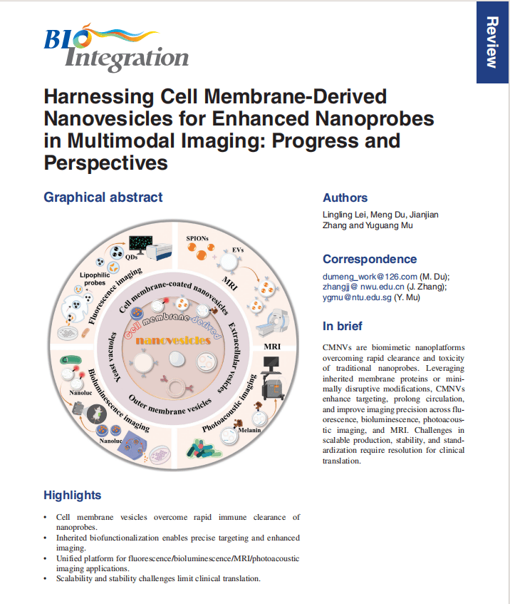 近日,由西北大学张健健教授和新加坡南洋理工大学慕宇光副教授发表于BIO Integration的综述《Harnessing Cell Membrane-Derived Nanovesicles for Enhanced Nanoprobes in Multimodal Imaging: Progress and Perspectives》,系统阐述了利用细胞膜衍生纳米囊泡改造纳米探针的前沿策略。本文将带你了解这一“仿生伪装”技术如何引领多模态成像进入新阶段。