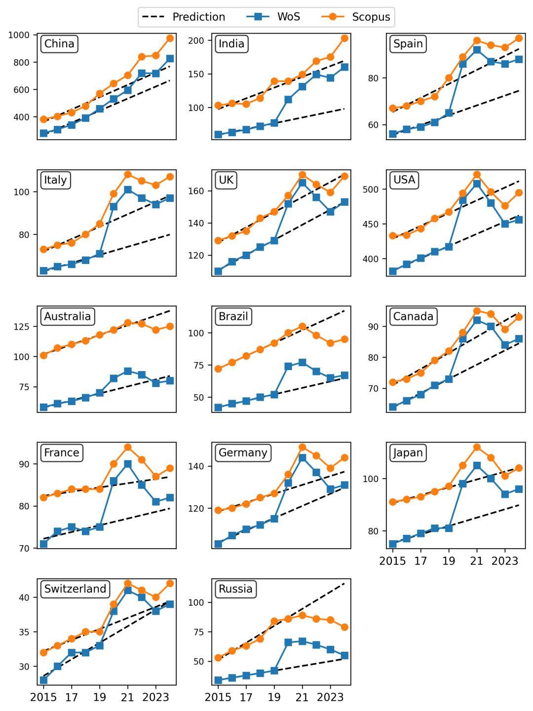 相比之下,俄罗斯的科研产出自2021年后持续下滑,可能受到了地缘政治因素的叠加影响。