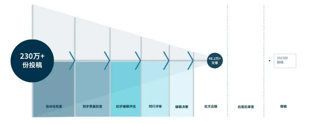 2024 年,我们收到了超过 230 万份投稿,其中仅有 48.2 万余篇文章得以发表。为了确保发表值得信赖的高质量研究,我们在编辑流程和出版流程中嵌入了多项科研诚信核查机制。这些机制由 AI 工具、高度专业化的科研诚信团队以及编辑共同支持和指导。