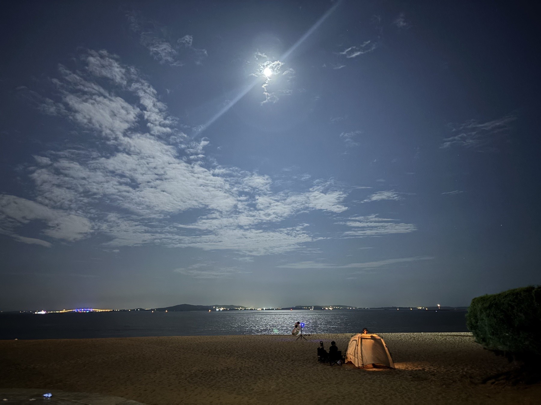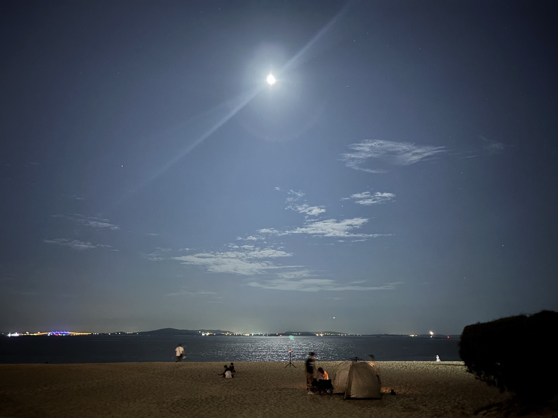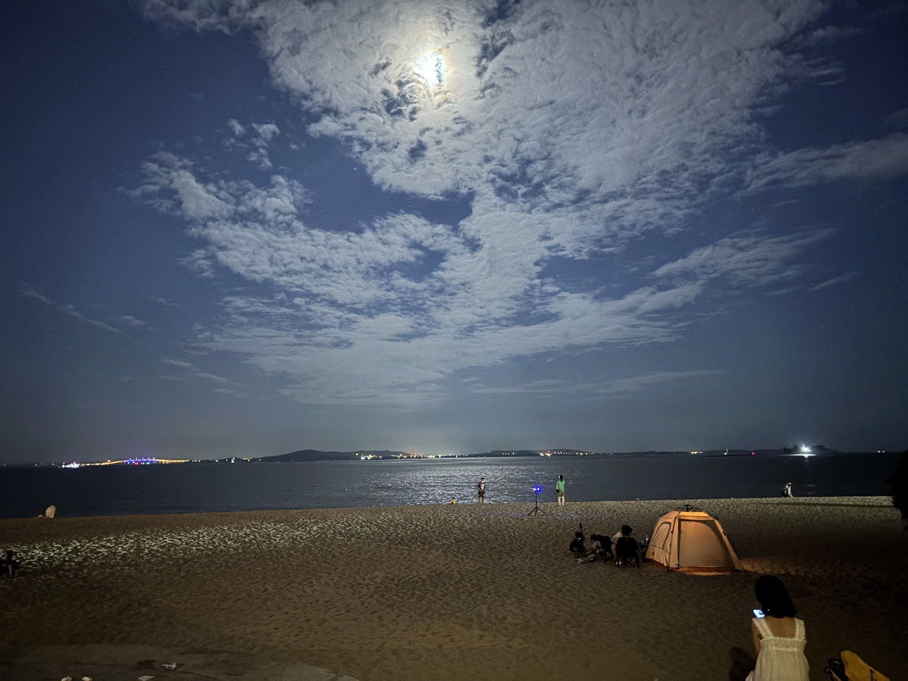 (驾车游厦门,夜晚坐在海岸边,在明月下遥看金门灯火,听海浪,吹海风,心旷神怡)
