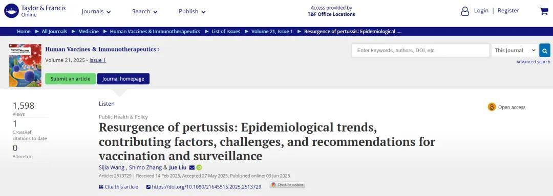 为系统揭示这一问题,北京大学公共卫生学院刘珏研究员团队在 Human Vaccines & Immunotherapeutics 期刊发表了题为 Resurgence of pertussis: Epidemiological trends, contributing factors, challenges, and recommendations for vaccination and surveillance 的论文。该研究全面回顾了全球百日咳流行趋势,总结其影响因素,评估当前疫苗接种与监测工作的进展与挑战,并就疫苗接种和监测策略提出具体建议。