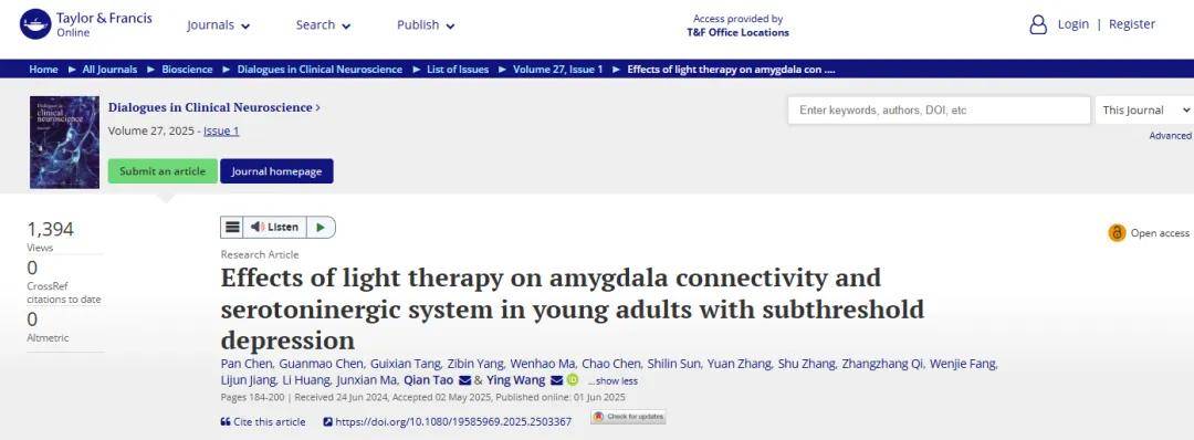 尽管亮光疗法(BLT)的神经机制尚不明确,但其被视为改善青年阈下抑郁(StD)的有效干预手段。杏仁核已被证实在抑郁进程中起关键作用。暨南大学科研团队通过临床试验评估BLT与杏仁核亚区功能连接(FC)改变的关系,及其与单胺能系统活性的关联。研究成果近期以Effects of light therapy on amygdala connectivity and serotoninergic system in young adults with subthreshold depression为标题发表在Taylor & Francis旗下著名临床神经学期刊Dialogues in Clinical Neuroscience。