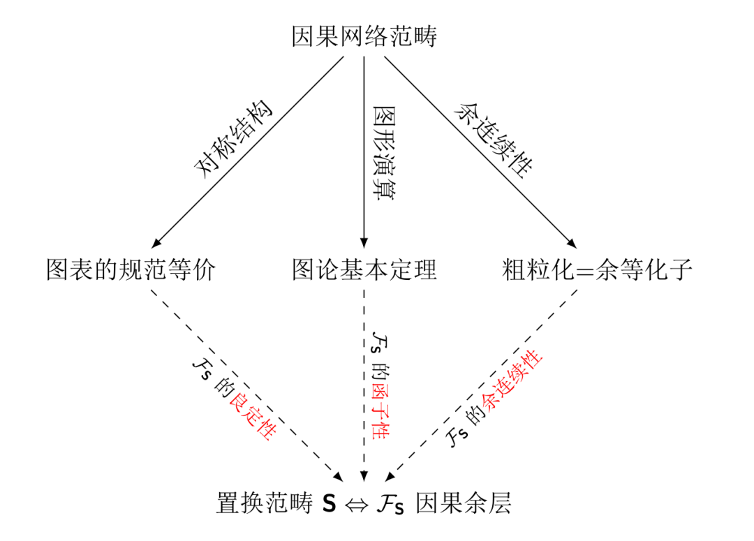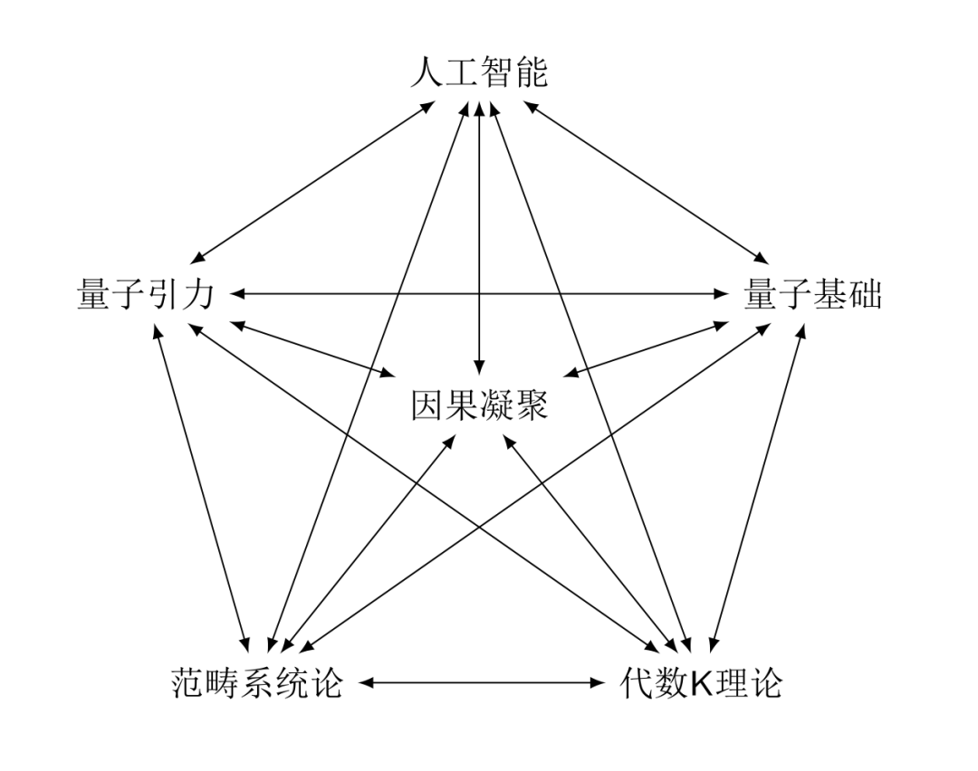 因果凝聚框架揭示了因果网络和对称幺半范畴的天然联系, 为因果性的科学研究开拓了全新的维度. 在相对论中, 因果网络表示的是物理因果过程, 是扭量(光线)的网络; 在量子力学中, 对称幺半范畴表征了量子信息过程; 在凝聚态物理中, 对称幺半范畴表示材料的量子序.如下图所示, 在对称幺半范畴, 因果余层和因果凝聚函子之间应该是一一对应的关系, 我们把这一结论称为"知行合一定理", 并把它看作是智能科学的基本原理之一. 直观的理解就是, 对称幺半范畴相当于一个百科全书, 是一个浓缩的知识库; 因果余层则刻画了知识库中的知识按照因果关系的结构进行分类的过程; 每一个范畴则相当于学生的头脑, 因果凝聚函子描述的则是每一个学生对知识库进行学习后得到结果. 对知识库中的所有知识进行展开的过程, 可以用格罗腾迪克构造描述. 我们也可以把对称幺半范畴理解为量子信息, 每一小范畴理解为语境, 因果凝聚函子则表示量子信息在每一语境中的意义, 以及在不同语境之间的转换关系. 这些在不同领域内的意义将在后文中将详细展开.