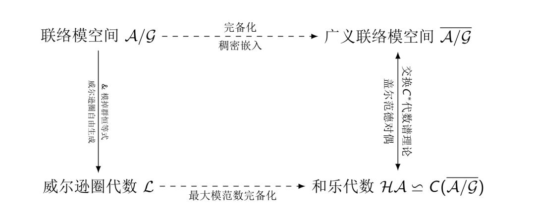 在数学物理领域, 联络模空间的研究有了一些根本性的进展. 这些进展具有三大特色, 第一是大量地使用了泛函分析和非交换几何的框架和技术, 第二是对投影技术在非线性情形进行了推广, 第三就是对格点规范理论的思想借鉴和图嵌入技术的使用. 粗线条地讲, 在1992年, 阿什台卡和伊沙姆[AL92]首次严格定义了联络模空间上的观测量代数(和乐代数), 证明了它是一个交换的星闭代数(C*代数). 利用盖尔范德的谱理论(盖尔范德对偶), 观测量代数的盖尔范德谱给出了联络模空间的完备化空间(广义联络模空间), 这是一个紧致的拓扑空间, 观测量代数可以解释为其上的连续函数. 经典的光滑联络模空间可以自然地嵌入到这个完备化空间之中, 这一过程有一点像从有理数域完备化为实数域. 利用著名的GNS构造(或RMK定理), 他们证明观测量代数的任何循环表示都酉等价于广义联络模空间上关于某一个正规测度的平方可积函数空间(是一个希尔伯特空间, 内积由测度确定). [AL92]开启了严格化定义圈量子引力的纲领.