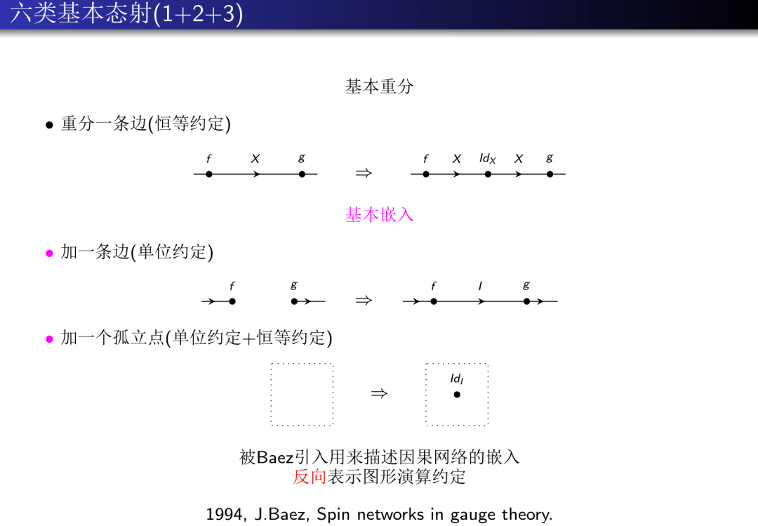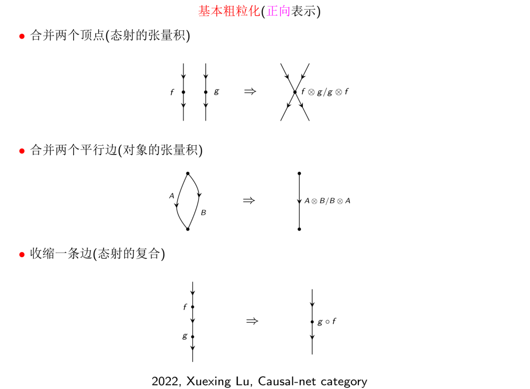 因果网络范畴中的六类基本态射可以分为三个子类, 第一个子类叫做基本重分, 它重分一条边, 即在一条定向边的中点加入一个顶点, 把这条定向边变为一个长度为2的定向路径, 这个过程对应于图形演算中的恒等约定. 第二个子类叫做基本嵌入, 它有两种类型, 一种叫做加边操作, 它在两个顶点之间引入一条定向边, 对应于图形演算中的单位约定; 另一种叫做加点操作, 它在图形中加入一个孤立点, 对应于图形演算中的单位约定和恒等约定的联合. 这三种类型的操作都是Baez在其自旋网络态的构造中引入的. 第三个子类叫做基本粗粒化, 它包含三种类型: 合并两个顶点, 合并两条平行边以及收缩一条边, 在图形演算理论中, 分别表示态射的张量积, 对象的张量积和态射的复合. 在合并顶点和合并平行边的情形, 其代数语义具有歧义(张量积的顺序性), 这和因果网络上的极化结构和图表的规范等价概念相关.