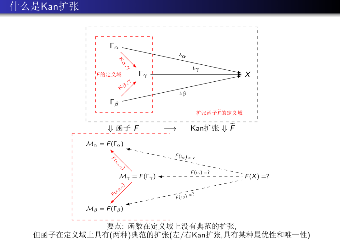一旦我们了解了对每一个时空其图嵌入系统本质上是一个逗号范畴, 接下来范畴学的抽象废话就会告诉我们应该考虑Kan扩张了. 一旦我们在因果网络范畴上定义了一个函子F, 那么自然地我们就可以考虑这个函子在时空范畴上的Kan扩张了.
