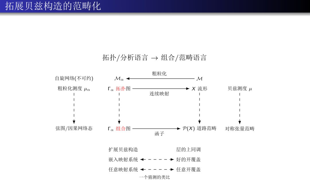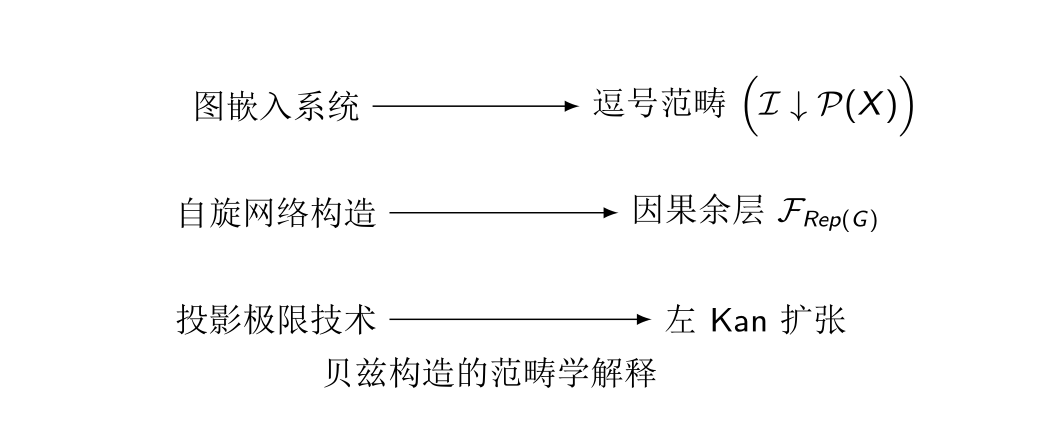 总结一下, 原始的贝兹构造, 在经过拓展化和组合化之后, 恰好可以形式为一个纯粹范畴学的构造, 它的图嵌入系统可以解释为嵌入函子和道路函子的逗号范畴, 自旋网络构造可以解释为结构群G的表示范畴所对应的因果余层, 而投影极限技术则恰好被解释为因果余层相对于嵌入函子的左Kan扩张.