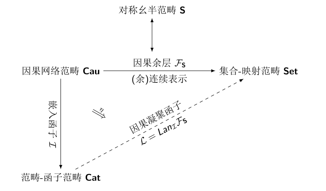 因果凝聚框架[Lu25]是关于对称幺半范畴(也称为置换范畴)的一般构造, 它把对称幺半范畴等价地翻译为因果网络范畴上的余层结构, 并通过左 Kan 扩张得到范畴-函子范畴上的因果凝聚函子. 关于因果凝聚框架定义的细节可以参看文献[Lu25]. 对称幺半范畴和因果余层的一一对应可以理解为是对称张量范畴的nerve定理, 是小范畴的格罗滕迪克-西格尔nerve定理[Gro60, Seg68]的平行推广, 把定向线图的范畴推广到因果网络范畴. 把对称幺半范畴解释为因果网络范畴上的余层(左连续函子或者保余极限的函子)与把小范畴(small category)解释为满足西格尔(Segal)条件的单纯集(E_1空间或局部常值的一维因子化代数)是完全相似的套路. 在某种意义上, 我们也可以说对称张量范畴是因果网络范畴的(余)连续表示.