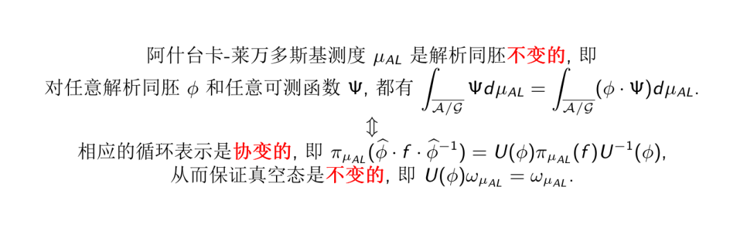 在1993年, 阿什台卡和莱万多斯基[AL93]首先建立了广义联络模空间和Hoop群表示的一一对应关系, 完整地刻画了解析和乐代数的盖尔范德谱. 然后, 利用群流形上的哈尔测度和投影技术, 定义了广义联络模空间上著名的阿什台卡-莱万多斯基测度, 它是一个正规测度, 也是解析和乐代数上的一个具有解析同胚不变性的广义测度(正连续线性泛函). 这一理论表现出了很好的代数化特征, 特别是在刻画广义联络模空间和使用投影技术这两个方面.阿什台卡-莱万多斯基测度可以用其解析同胚不变性唯一刻画[OL03].