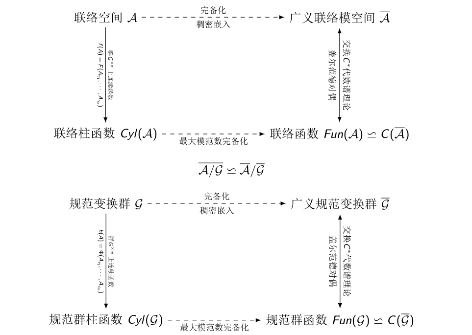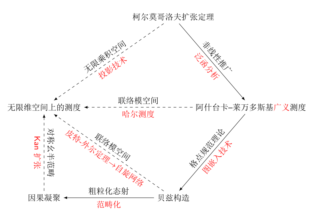 1933年, 柯尔莫哥洛夫公理化了概率论[Kol33], 把概率理解为特殊的测度, 把概率论置于测度论的公理化框架之下. 柯尔莫哥洛夫扩张定理[2], 也称柯尔莫哥洛夫一致性/相容性定理, 是随机过程理论的基石, 是构造构造无限乘积空间和路径空间上概率测度的基本方法, 它证明了无限乘积空间上概率测度和有限维因子概率空间一致族的等价性, 确立了随机过程的理论与现实基础. 柯尔莫哥洛夫扩张定理有两种范式, 一种采用投影极限的形式, 一种采用的是 sigma 代数族的形式. 前者更倾向于范畴论的泛性质特点, 后者需要利用 Carathéodory 延拓程序.除了无限乘积空间和路径空间之外, 联络模空间是数学物理中另一类重要的空间. 联络模空间是非微扰量子规范理论研究的出发点. 对任意李群和主丛, 其上的联络空间是一个无穷维仿射空间, 在无穷维的局域规范变换群的作用下, 其商空间一般是无穷维的非线性的奇异空间, 称为联络模空间. 非微扰量子规范理论的根本问题就是定义和计算联络模空间上的量子测度和观测量之间的关联函数, 这个范式称为路径积分或历史求和, 是量子场论的一个根本的范式.
