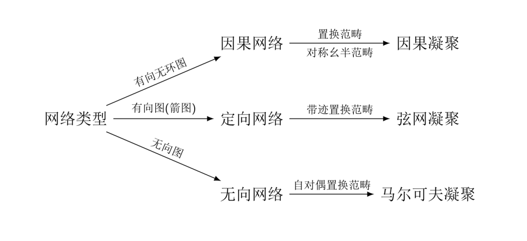 因果凝聚框架提供了一个研究对称张量范畴的全新范式. 事实上, 根据网络类型的不同, 存在三个平行的框架. 如下图所示, 存在三种基本的网络类型, 分别为有向无环图(因果网络), 有向图(箭图或定向网络)和无向图(无向网络), 它们的连续表示分别是对称幺半范畴, 带迹的对称幺半范畴和自对偶的对称幺半范畴. 相应的框架, 分别称为因果网络凝聚(简称因果凝聚, 或称贝叶斯凝聚), 自旋网络凝聚(简称旋网凝聚或称弦网凝聚)和无向网络凝聚(简称图凝聚,或称马尔可夫凝聚).