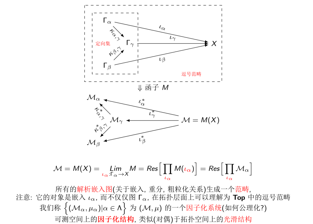 图的嵌入以及它们之间的嵌入, 重分, 粗粒化关系生成一个范畴(因果网络范畴). 如果把图看作是一个拓扑空间, 嵌入映射是连续映射, 那么, 对于每一个时空X,这样的系统实际上就构成一个拓扑空间和连续映射的范畴(时空范畴)中的一个逗号范畴(关于嵌入函子和时空X).