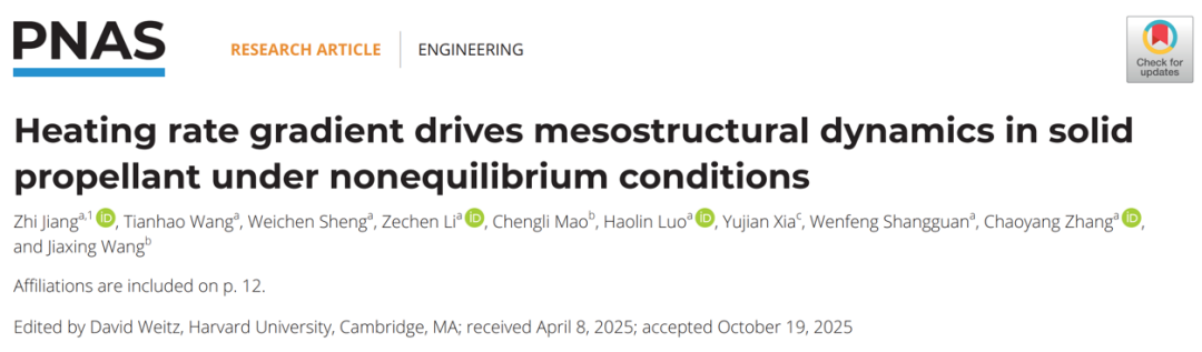 上述研究以“Heating rate gradient drives mesostructural dynamics in solid propellant under nonequilibrium conditions”为题,发表于《国家科学院院刊》(PNAS, 22, 2508143122 (2025),DOI: https://www.pnas.org/doi/abs/10.1073/pnas.2508143122) 该研究工作融合工程热物理、凝聚态物理、化学物理等学科,与精密仪器技术、计算机科学等领域深度交叉,最终应用于航天动力工程。此前,团队已在包括Combustion and Flame等期刊发表该方向多篇相关论文,并牵头制定了该方向宇航学会团体标准,逐步形成了从基础科学发现、到技术突破、再到标准引领的研究体系。