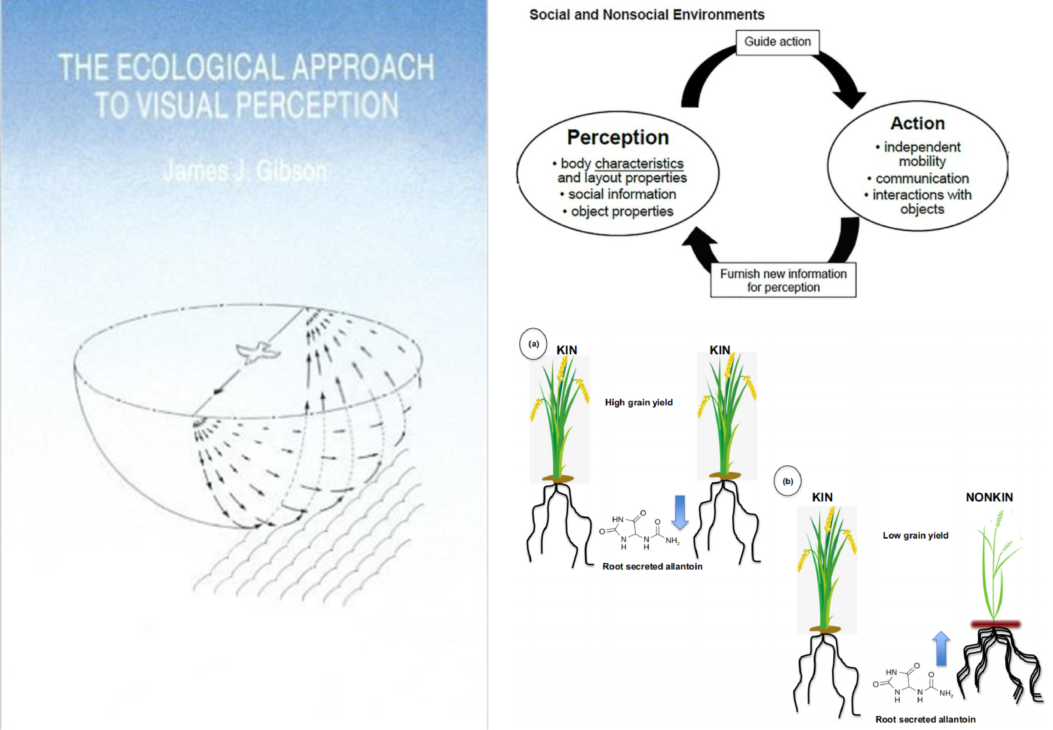 左:传统神经中心主义认知模型(以大脑为核心);右上:吉布森生态心理学的感知-行动耦合系统;右下:水稻亲缘识别实验示意图(亲缘植株通过减少尿囊素分泌降低根系竞争)(Huang et al., 2018)
