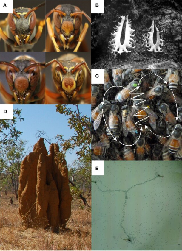 社会性昆虫的低成本认知策略(A-E):黄蜂面部识别、蜜蜂舞蹈通讯、白蚁集体筑巢等,展示了无复杂神经系统生物的智能行为。这些案例为理解植物认知提供了类比参考——植物虽无神经组织,却通过细胞信号网络实现类似的环境适应与群体协调(Lihoreau et al., 2012)。
