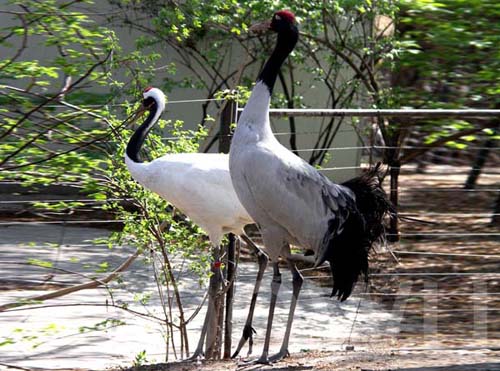 丹顶鹤,顾名思义,戴“丹顶”的鹤;但这句话可不能反过来:凡戴“丹顶”的鹤都是丹顶鹤。值得注意的是,我们当中很多一批同志都是这么认为的。一个星期天,我在北京动物园里欣赏动物,当我踱到新开辟的涉禽散放区的时候,看到大家都在观赏美丽的鹤,几乎所有过往的家长都指着一只戴“丹顶”的鹤给他们的孩子们讲“瞧,丹顶鹤多漂亮啊!”。这只戴“丹顶”的鹤的确很漂亮,但是它真的不是丹顶鹤,而是比丹顶鹤更加珍稀的黑颈鹤。正巧,这时候,一只从远处觅食归来的丹顶鹤文质彬彬地踱到观鸟台前,和那只备受瞩目的黑颈鹤站到了一起。多么好的机会,我连忙按下快门抢下了这张难得的“教学照”。