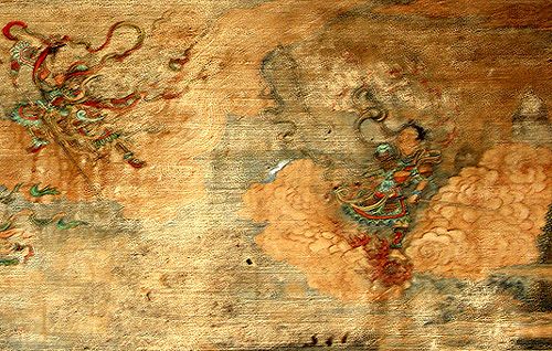 在这些彩画中特别值得一提的是其中的八幅。它们分别位于镶嵌在长廊中的亭子里。长廊共连有四座八角重檐的亭子,象征春、夏、秋、冬,分别名为留佳亭、寄澜亭、秋水亭和清遥亭,八幅彩画就位于这些亭子的顶棚内侧下方,留佳亭内彩画为“武陵春色”和“乱天宫猴王斗哪吒”,寄澜亭中为“葭萌关张飞夜战马超”和“八大锤大闹朱仙镇”,秋水亭中为“岳飞枪挑小梁王”和“竹林七贤”,清遥亭中为“赵子龙大战长坂坡”和“虎牢关三英战吕布”。这八幅彩绘的形制均为矩型壁画形式,与廊间那些半圆型的“包袱”彩绘不同,画面气势磅礴,人物勾勒细腻,细节处理精致,颜色含蓄古朴,一看便知是出自高人之手,其艺术造诣远在廊间他画之上。(段煦 文/摄影 博物地理 www.bowudili.cn )