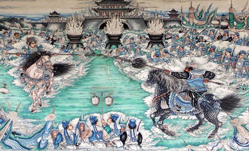 《西游》故事尽人皆知,画出新意,此幅画面所描绘的人物形象受明以来水陆道场壁画影响,飘逸神俊,有吴带当风之笔。画面描写孙悟空被骗天上,官封“弼马温”,他一气之下,撞出南天门,回花果山自封“齐天大圣”,玉帝命托塔李天王李靖、哪吒三太子前去捉拿妖猴。孙悟空先把巨灵神打败,又对哪吒说道,回去告诉你那玉帝老儿,让我做了“齐天大圣”便罢,否则定要打上凌霄宝殿。
