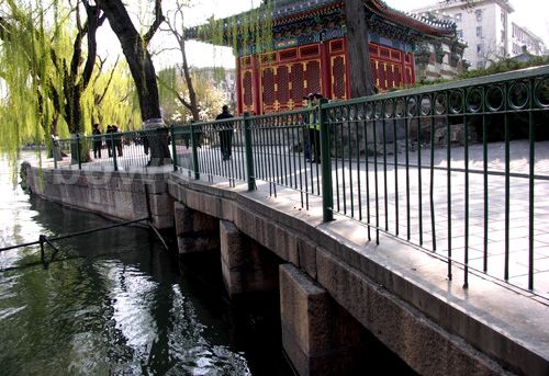 这是北京北海公园西侧堤岸上的一座平坦的石板桥。与其他园林中的桥梁相比,桥身上既无华丽的雕栏,也无秀美的装饰,只是厚重的长方形花岗岩桥墩承托起同样厚重的花岗岩桥身。公园的管理者在桥身上铺上与四周地面一色的水泥地砖,使无数游人从桥面上通过时很难发觉自己是在过桥。就是这看似普通得不能再普通的石板桥,有谁相信它竟是清政府在北京城内所建的第一条正式铁路——“西苑铁路”的地面遗存呢?