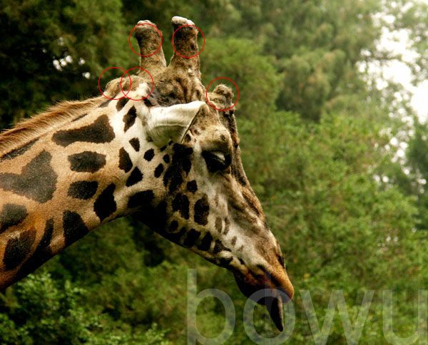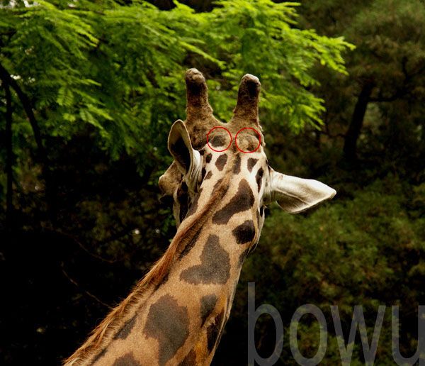 远远看去,的确只能看见长颈鹿头顶上有两只棒状的角。如果这时候长颈鹿在你面前低下头来,你就会发现它的鼻梁上方还挺立着一只独立的角。这样的话,它就有了三只角,即中间那只独立的角和头顶上那两只棒状的角,从正面看,它就象戴了一顶三个叉的王冠。现在你知道了,长颈鹿不仅有两只角。不过,可还别急着欢呼!如果这时候,长颈鹿在你面前转过头去,那么你就能看到它的后脑勺上还有两个小小的鼓包,虽然小,但也算两只角。好,现在角的数目上升到五只了。这样的角和鹿科动物的角有很大区别,鹿科动物如梅花鹿、马鹿、驯鹿、驼鹿的角都是分叉的骨质角,这种角在刚长出来的时候被角心周围的一层富含血管组织的嫩皮所包裹(俗称鹿茸),待角长成后,嫩皮逐渐老化、脱落,最终显露出骨质的角,这些角每年呈周期性的脱落和重新生长,成为鹿科动物的基本特征之一,而长颈鹿属于长颈鹿科,它的角也被特称为长颈鹿角,虽然这样说可能有点绕嘴。长颈鹿的角被皮肤所包裹,表面还覆盖着一层棕色的茸毛,与鹿科动物不同,如果不出意外,长颈鹿角是要戴一辈子的。(作者:段煦)