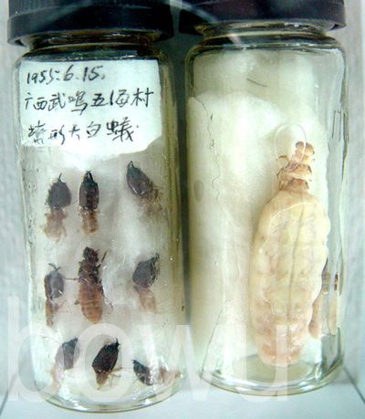 在白蚁的家族中,除了有雌性和雄性外,还有雌雄特征都不明显的中性蚁,它们主要负责防御敌人入侵和日常的家务。左侧试管中的就是这些中性蚂蚁的标本。那些头上长着一对大颚的蚂蚁叫兵蚁,负责防御;头上没有大颚的叫工蚁,负责采集食物和日常家务。右侧试管中的“庞然大物”是白蚁家族的统治者--蚁后,它实际是一台活的生育机器,它不干活,靠工蚁的喂养为生,它唯一的任务就是为白蚁家族繁殖更多的后代,白蚁的蚁后一生可产几百万个卵。