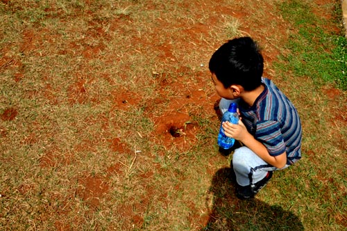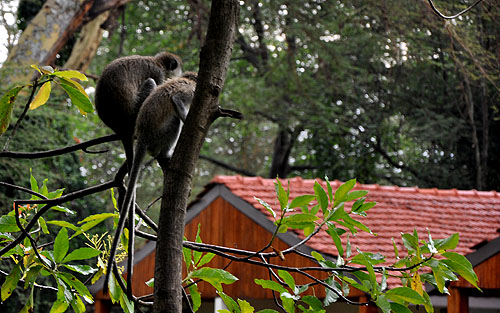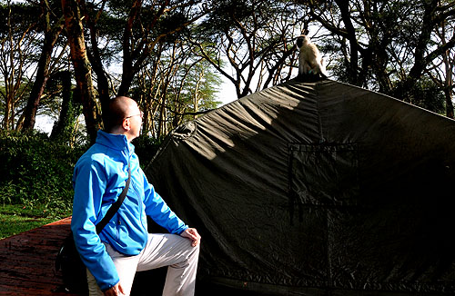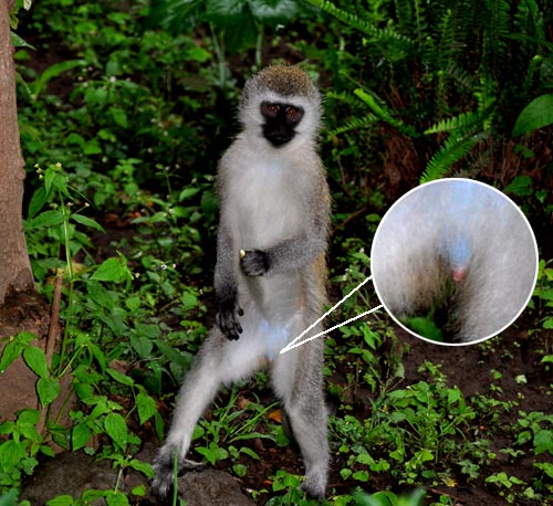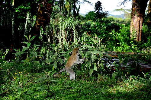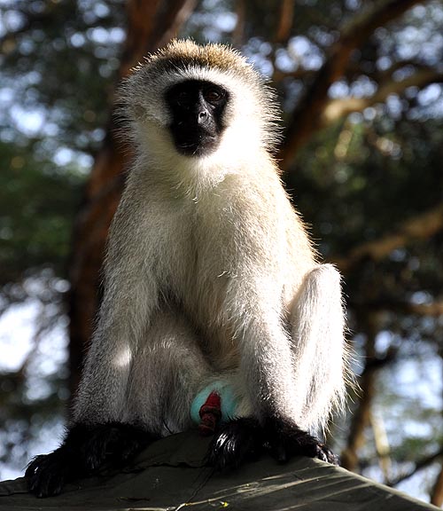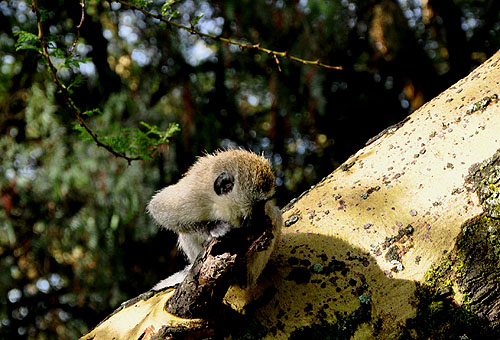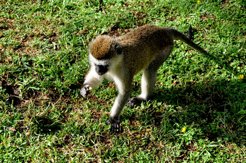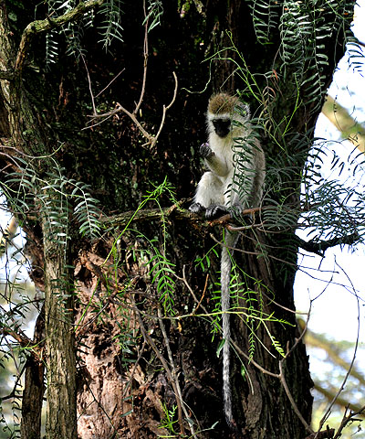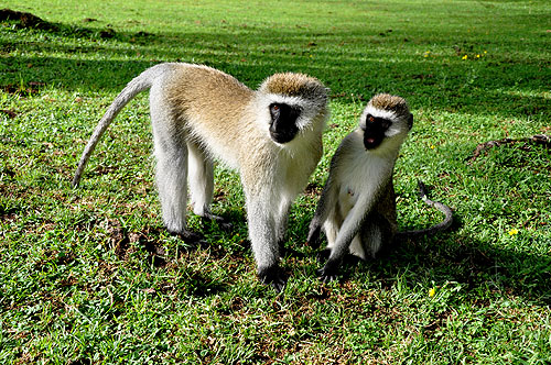 大鼎——我们此次东非之行最年轻的同志。他研究动物的方式很特别,例如,他看到这里的蚂蚁洞大得能扔进一个鸡蛋去,结果,他就用自己的口腔作为量筒——含口水吐进去,来研究一下这种洞穴到底能盛几口水......而在他研究猴子的时候就不那么顺利了,尽管他目前研究的只是一种比较温和的猴子——绿猴Cercopithecus aethiops,也叫绿长尾猴、非洲草原猴,我们却总是千方百计地去干涉他,严禁他去招惹那些喜欢唧唧歪歪的家伙们。原因是:我们的下一目的地是马赛马拉草原,那里的另一种猴子——狒狒可不这么温顺,不仅喜欢吃肉,还喜欢猎杀,在狒狒看来,大鼎同志手里总是攥着的零食与他的手指几乎没有什么区别——它们都是能吃的东西!如果大鼎同志一旦认为猴子是种不危险的动物,那么,这件事的本身就成了一件很危险的事情。