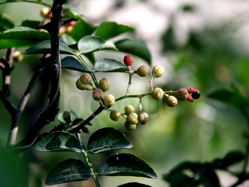北京老年间有一个谜语,叫“小了青,大了红,老了张开嘴儿,露出个大铃铛”,照片里的果实就是本谜的答案。你瞧,它在未成熟的时候正好是青的,而将要成熟的时候又正好是红的,等真正成熟了就破裂成两半,所露出的乌黑油亮的种子还真象个大铃铛。这就是我们做菜用的调料——花椒挂在树稍时的样子。