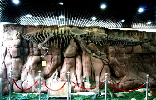 与传统的恐龙展出方式所不同的是,这次展出的恐龙采用了国外先进的浮雕式装架方式,这是庞然大物中华盗龙的正形标本