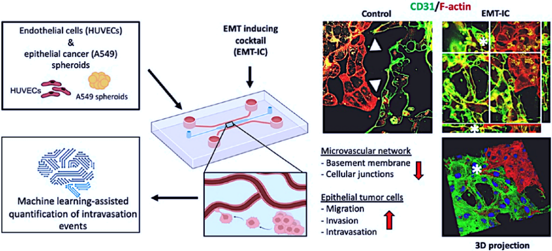 图1 文章概览图:在微流控芯片上培养内皮细胞和上皮癌细胞,加入EMT诱导物,生成肺癌侵袭模型,并通过机器学习技术进行智能可视化监测和量化分析血管内侵袭事件。