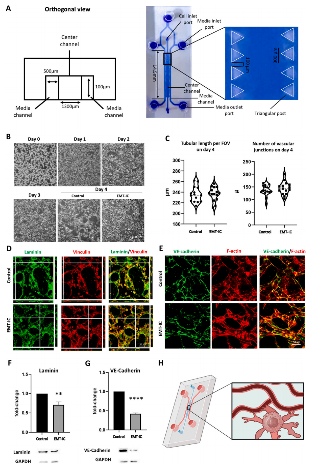 图2 EMT-IC对MVNs稳定性和完整性的影响。在与EMT-IC或对照培养基(不含TGF-β1的未处理EGM-2)孵育24小时后,对MVNs进行层粘连蛋白(laminin)、连接蛋白(vinculin)和VE-钙粘蛋白(VE-cadherin)的免疫染色。F-肌动蛋白(F-actin)通过鬼笔环肽(phalloidin)染色可视化。(A) 三通道微流控设备的图片和尺寸。(B) 代表性显微照片,显示在有或无EMT-IC引入的微流控设备中,HUVEC细胞在第3天形成MVNs 24小时后的情况。(C) 使用ImageJ血管生成分析仪插件对每视野总管状长度和血管连接点数量进行量化。(D) 共聚焦显微镜Z轴堆栈图像,显示层粘连蛋白和连接蛋白共染色的正交视图。白色线条表示横截面位置,侧面显示正交横截面。(E) 共聚焦显微镜Z轴堆栈图像,显示VE-钙粘蛋白和F-肌动蛋白共染色的最大投影。(F) 层粘连蛋白和 (G) VE-钙粘蛋白的Western blot及其光密度条带分析,标准化至第4天收集样本各自的GAPDH水平。蛋白质水平以倍数变化表示,并与对照组进行比较。(H) 芯片上癌症模型的示意图。**,p < 0.01;****,p < 0.0001。n = 3个生物学重复。