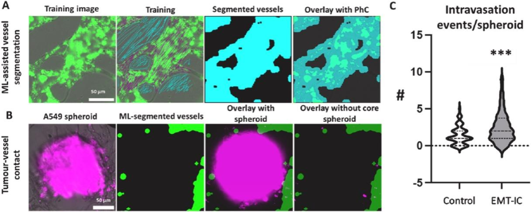 图3 机器学习辅助的血管内侵袭评估示意图。(A)血管分割:训练过程中,蓝色线条代表背景;品红色线条代表血管;蓝色实心区域代表自动分割识别出的血管;(B)肿瘤血管接触定量:绿色实线区域代表ML分割出的血管;品红色代表荧光标记的A549细胞;与球体重叠的品红色代表二值化后的A549细胞球体图像;(C)ML辅助下每个球体内渗事件的自动识别与量化。∗∗∗,p< 0.001。对照组:72个球体;EMT-IC:从11个生物学重复中收集的107个球体。
