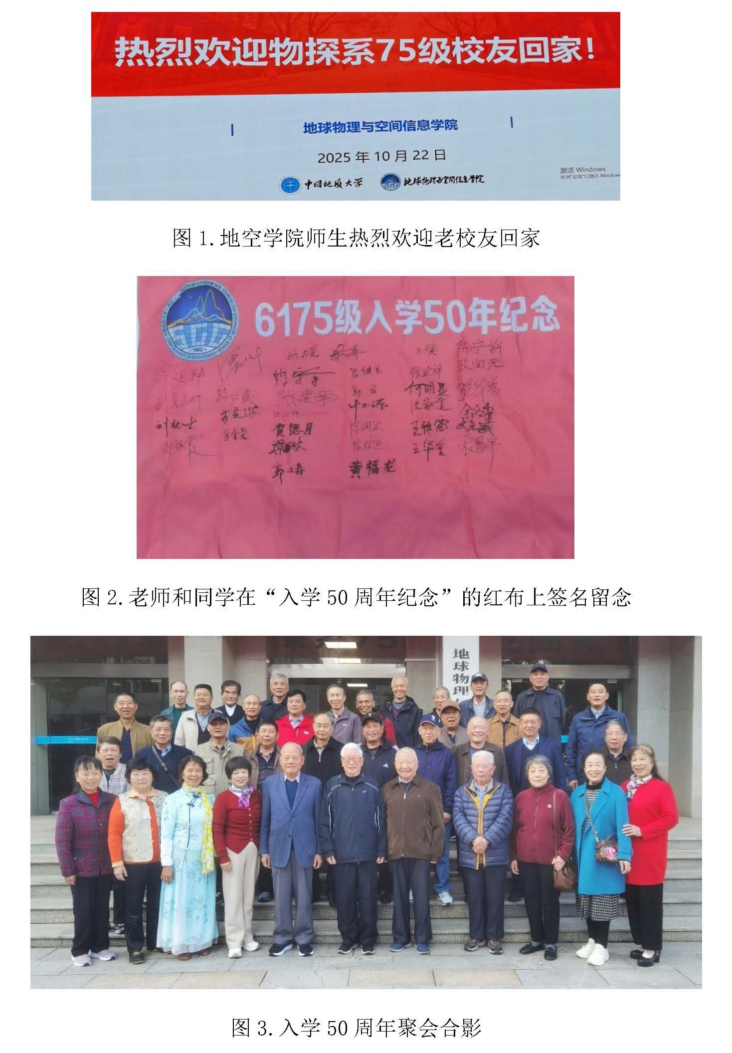 1975年8月26日我们乘坐北京至武汉的火车专列到武汉,开启了学校整体从北京迁往武汉办学的新征程,学校名称也同时改名武汉地质学院。当时我们分散在武汉市的五个地方办学:汉口原武汉地质学校(位于汉口航空路),武昌武汉教师进修学院(位于武昌胭脂路粮道街),华中农学院(狮子山),湖北省委党校(汉口中山公园附近),华中工学院为基建办公室,因为学校校址紧邻华中工学院的西边。3个月后学校响应国家号召,在武汉招收了第一届(即1975级)学生479人,涉及区域地质、地球化学、矿产地质与勘探、水文地质与工程地质、金属与非金属地球物理勘探(简称物探)、探矿工程和地质力学6个系7个专业,其中物探系1975级学生2个班60人,驻地为武汉教师进修学院《励精图治五十秋——中国地质大学简史,中国地质大学出版社,2002年;中国地质大学史1952-2012,中国地质大学出版社,2012年》。当年属于推荐上学,称为工农兵学员。今年是这一届学生入学50周年,他们决定在学校物探系,现更名为地球物理与空间信息学院举办入学50周年庆祝活动(图1)。